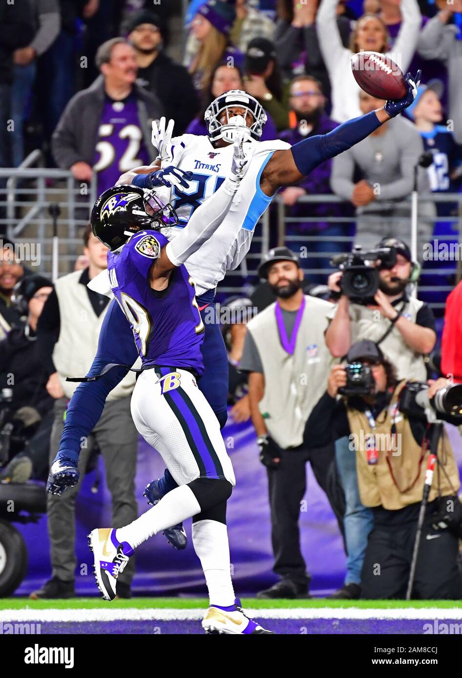 Baltimore United States 11th Jan 2020 Tennessee Titans Tight End Jonnu Smith R Scores Ahead Of Baltimore Ravens Cornerback Brandon Carr L On A 12 Yard Pass During The First Quarter Of Their